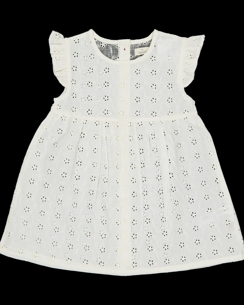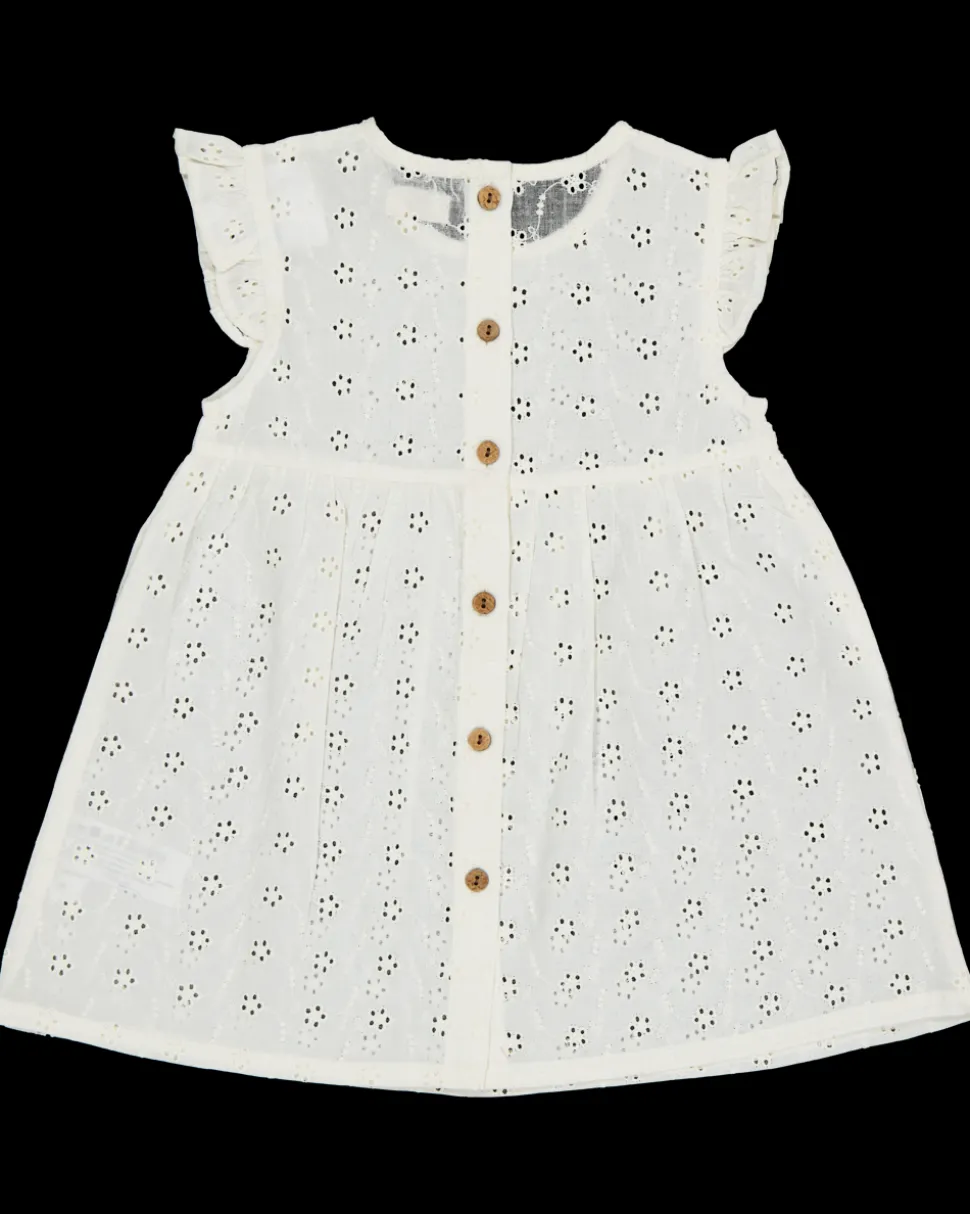 Dit witte meisjesjurkje is gemaakt van 100% katoen, waardoor het zacht en ademend aanvoelt. Het heeft schattige ruffles bij de schouders en een losvallende pasvorm, ideaal voor baby's. De knoopsluiting aan de achterkant maakt het gemakkelijk om aan en uit te trekken. Een prettig jurkje voor je kleintje.