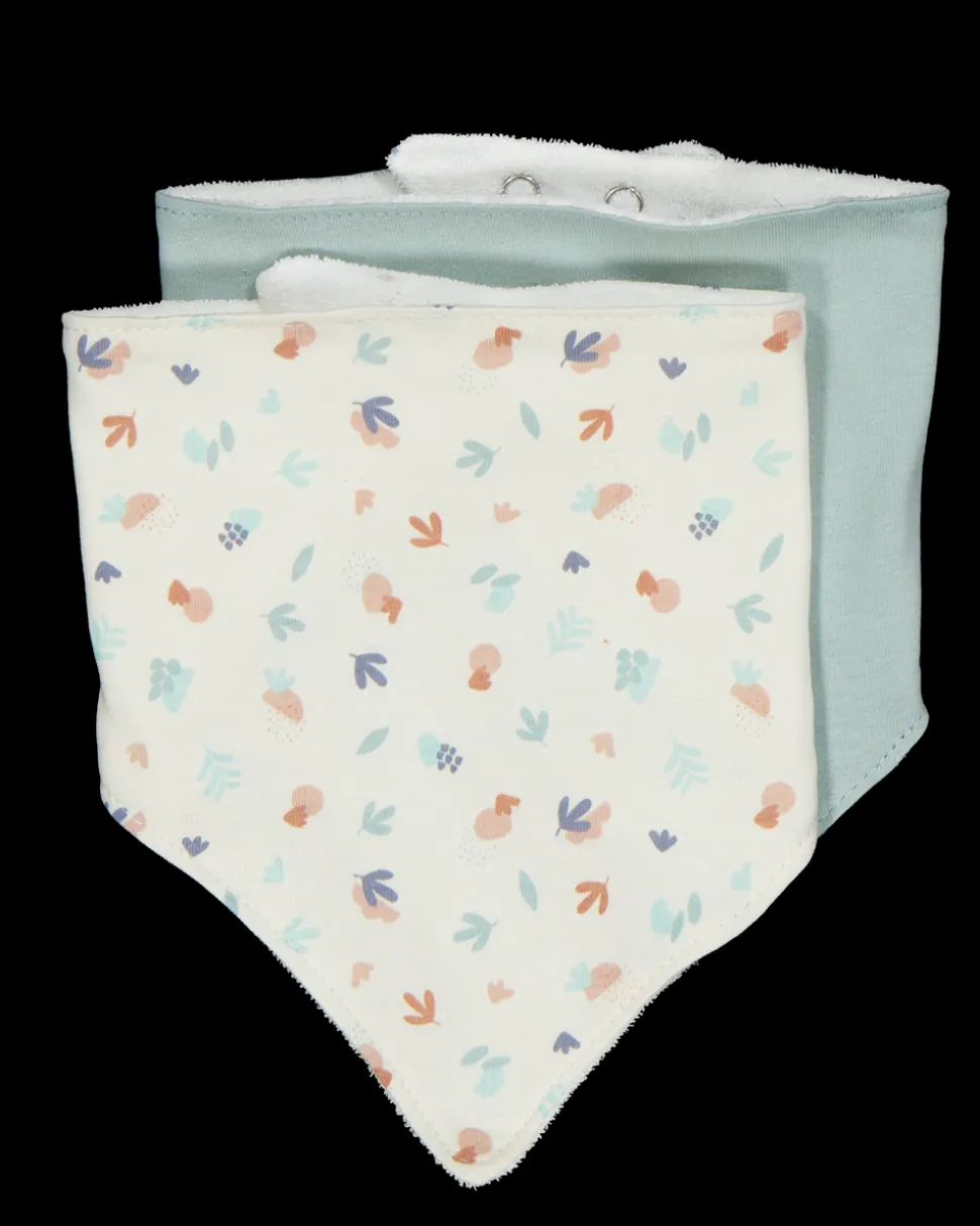 Deze set van twee slabbetjes is gemaakt van 100% katoen en heeft een groene kleur en een vrolijk patroon met bladeren en bloemen. De slabbetjes zijn handig met drukknopen, zodat je ze gemakkelijk aan en uit kunt doen. Ideaal voor het beschermen van kleding tegen vuil en druppels tijdens het eten.