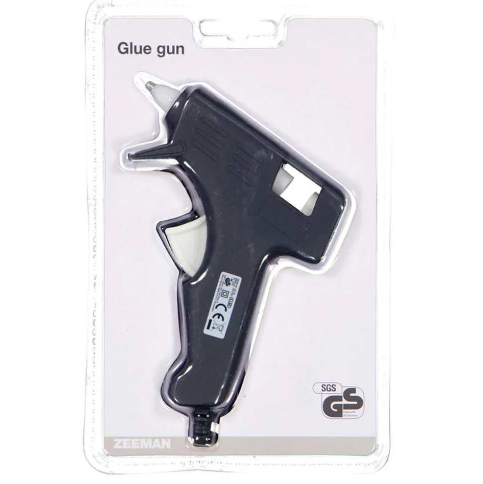 Een handzaam elekstisch lijmpistool. Dit lijmpistool is erg handig, omdat het klein is, maar wel erg makkelijk werkt. Stop de stekker in het stopcontact, stop de lijmstaaf in het pistool en druk op de knop. De lijmstaaf zal bij het uiteinde smelten en uit het pistool komen.
