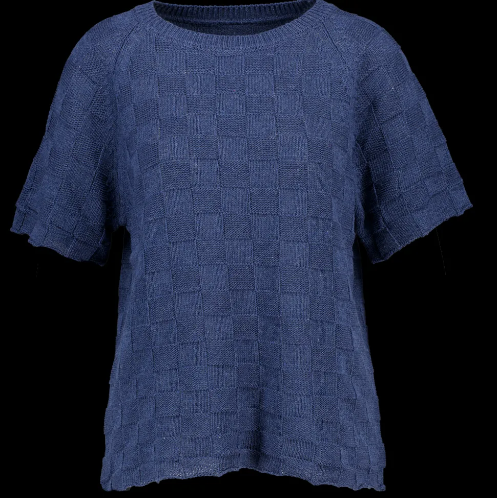 Deze donkerblauwe fijngebreide trui heeft een opengewerkt breipatroon met blokstructuur en korte mouwen. De trui is gemaakt met verschillende gerecyclede materialen, waaronder acryl en katoen. Ook verkrijgbaar in off-white.