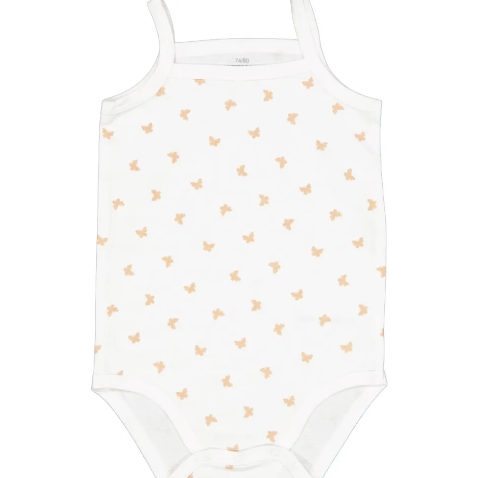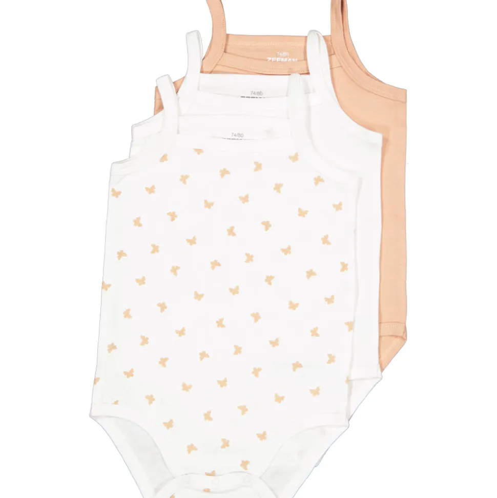 Drie mouwloze rompers voor baby's in de kleur bruin en wit, waarvan één met een lichtbruin vlinderpatroon. Ze zijn gemaakt van 100% katoen en geschikt voor zowel jongens als meisjes. Dankzij het katoen dragen ze comfortabel bij warm weer.