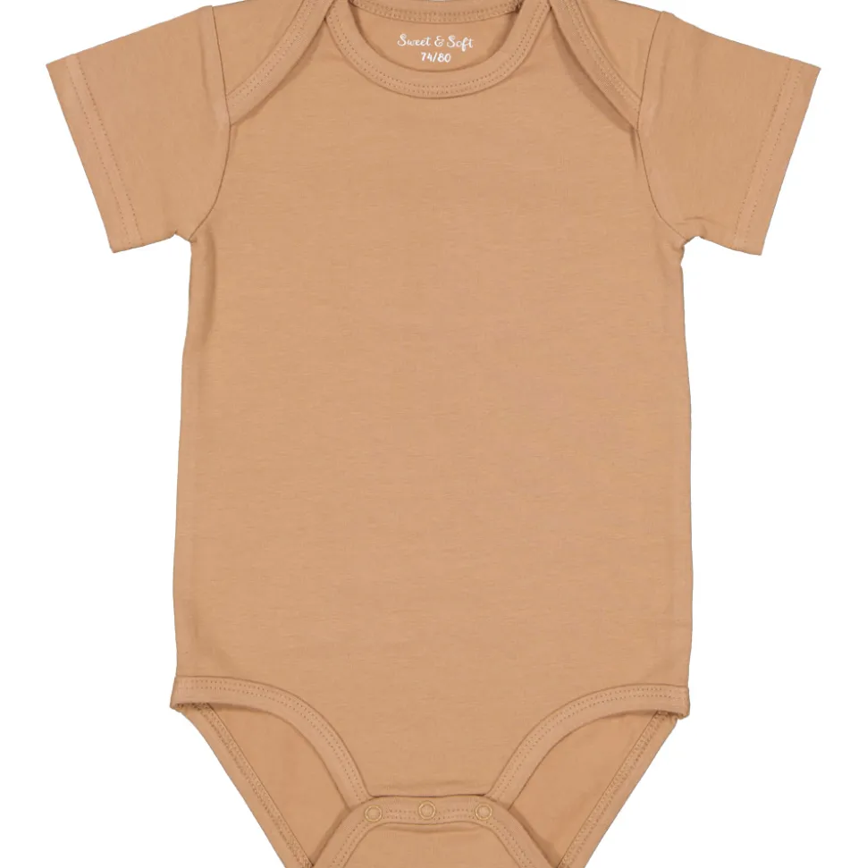 Deze romper is in de kleur bruin en heeft korte mouwen. Hij is gemaakt van 95% biologisch katoen en 5% elastaan, wat zorgt voor een zachte en licht rekbare stof. De romper is geschikt voor baby's van alle genders.
