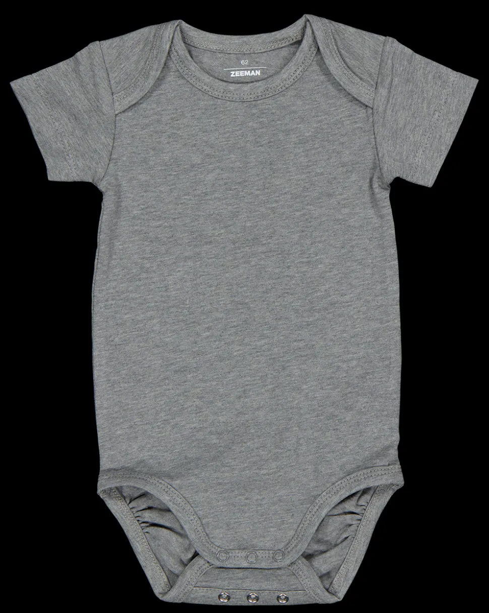 Deze romper in de kleur grijs is geschikt voor baby's en heeft korte mouwen. Het materiaal bestaat uit 95% katoen en 5% elastaan, wat zorgt voor comfort en een beetje rek. De romper is unisex en makkelijk aan en uit te trekken door de drukknopen.