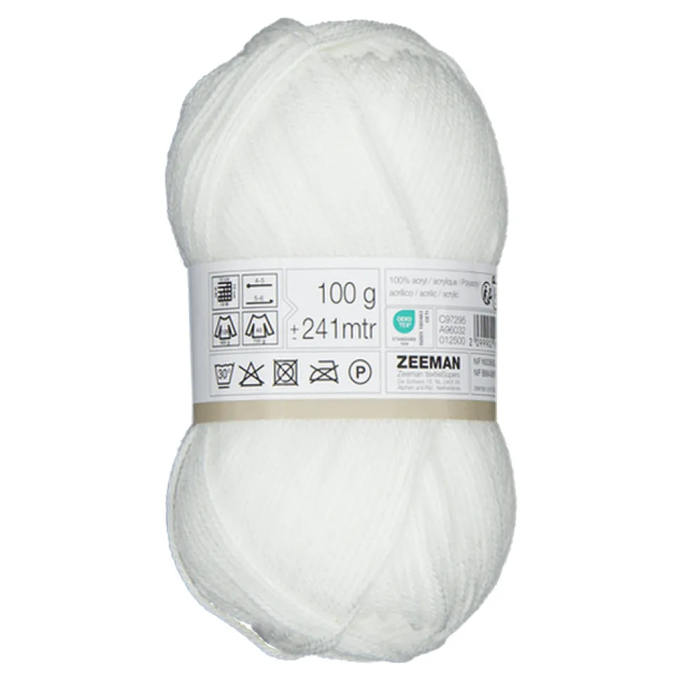 Dit witte breigaren is gemaakt van 100% acryl. Het heeft een gewicht van 100 gram en is geschikt voor breinaalden van 28. Met 18 steken per 10 centimeter werk je aan fijne, gelijkmatige breiwerken.