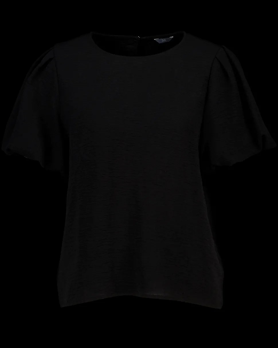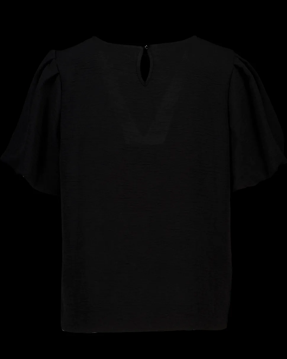 Deze zwarte blouse voor vrouwen heeft korte mouwen en is gemaakt van 100% polyester. Het materiaal voelt soepel aan en de eenvoudige kleur maakt het een geschikt kledingstuk voor verschillende momenten. De blouse heeft een ronde hals en een kleine opening met knoop aan de achterkant.