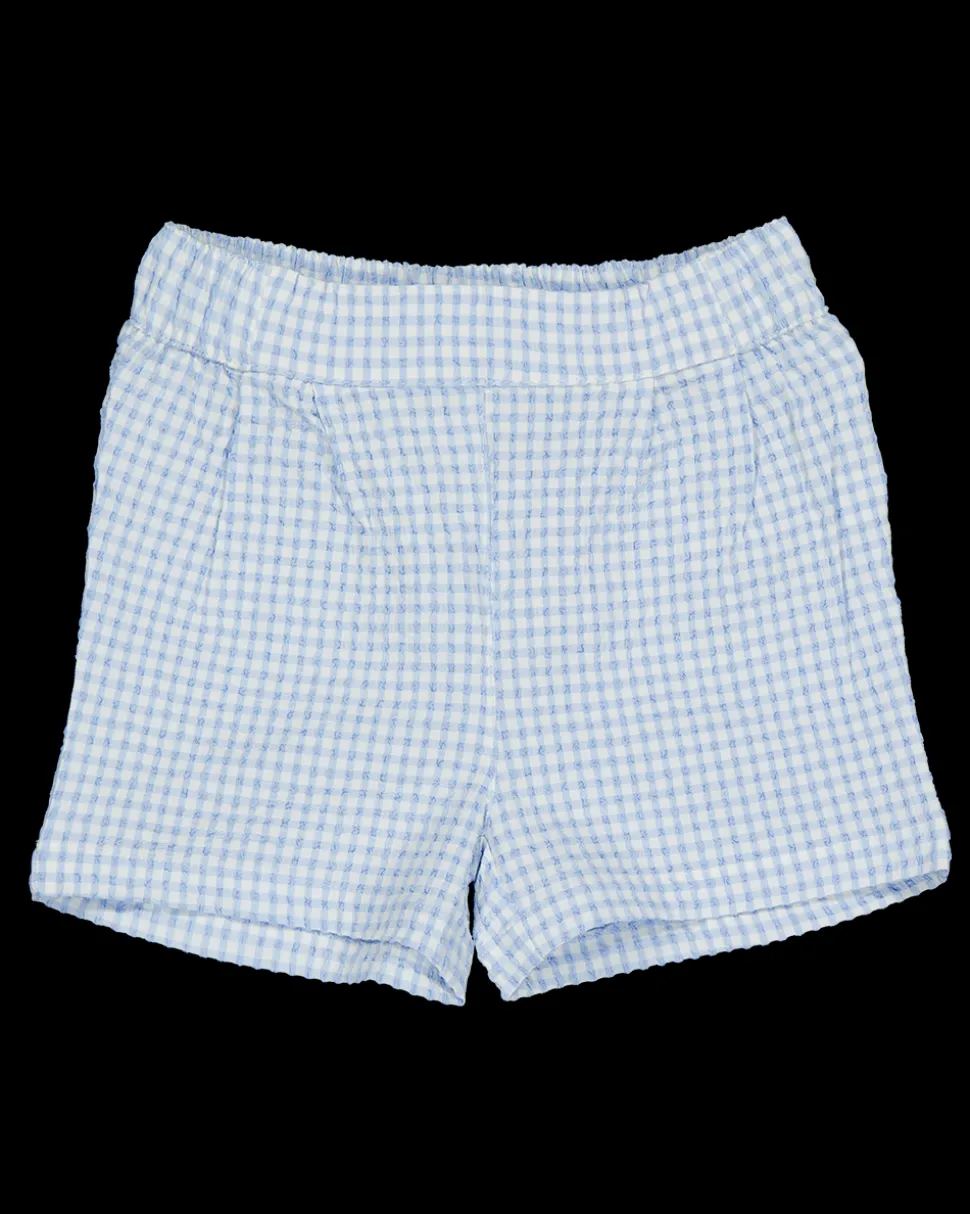 Deze korte broek is gemaakt van polyester met een beetje elastaan, wat zorgt voor wat rek. De broek heeft een ruitpatroon en is in de kleur blauw. Hij is bedoeld voor baby's en geschikt voor zowel jongens als meisjes.