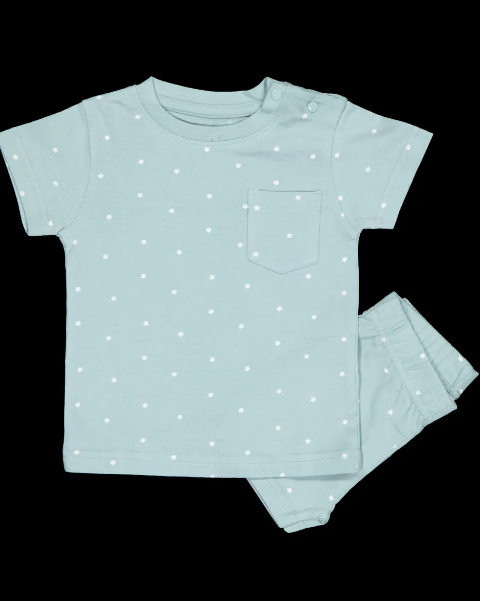 Deze shortama is geschikt voor baby’s en heeft een blauwe kleur met een klein patroon. De set bestaat uit een shirt met korte mouwen en een broekje. De stof is 100% katoen, wat zorgt voor een zachte en ademende draagcomfort. Hierdoor zit de shortama aangenaam voor jouw kindje.