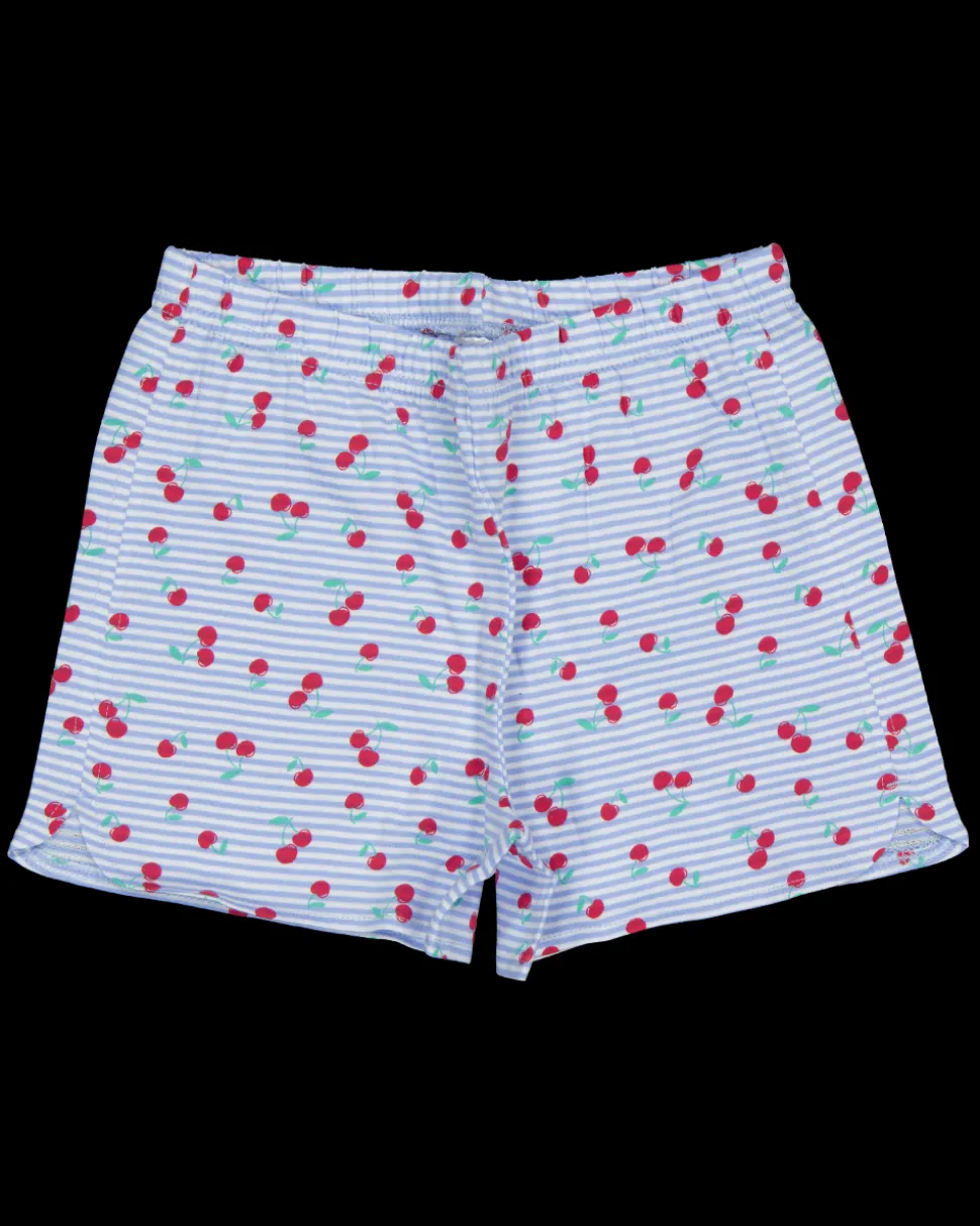 Deze shortama voor meisjes heeft korte mouwen en is gemaakt van 100% katoen. De stof is lichtblauw gestreept met een patroon van kleine rode kersen. De korte mouwen zorgen voor draagcomfort bij warme temperaturen.