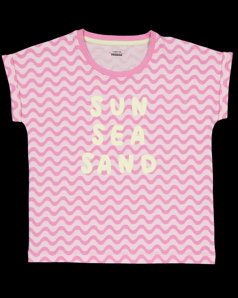 Deze shortama voor meisjes heeft korte mouwen en is roze van kleur. De top heeft een golvend patroon met letters op de voorkant. De set is gemaakt van 100% katoen, wat zorgt voor een zachte en ademende stof. Je draagt deze shortama comfortabel tijdens het slapen.