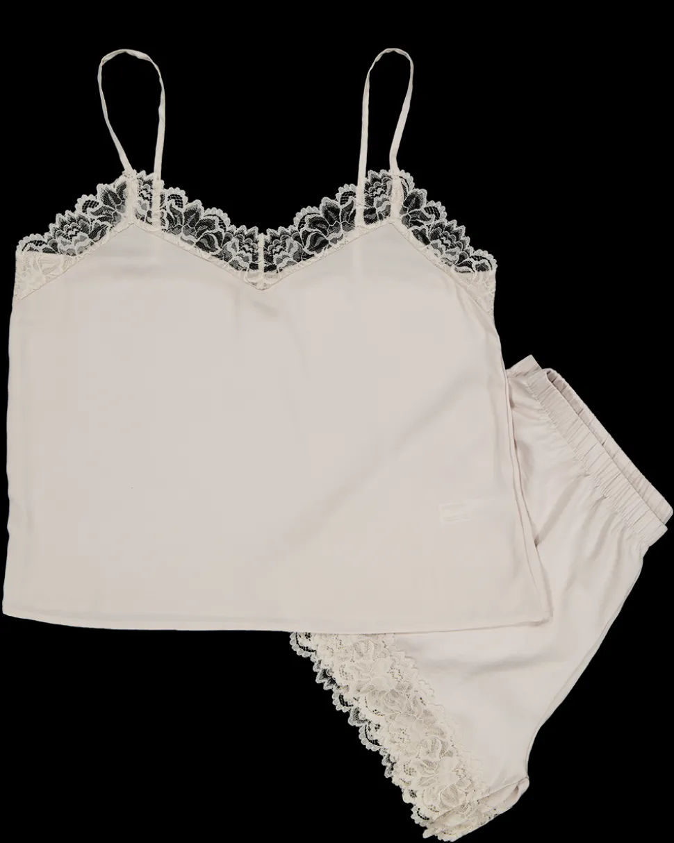Deze shortama voor vrouwen is mouwloos en gemaakt van satijn in de kleur roze. Het materiaal bestaat uit polyester met kant van polyamide en elastaan. De combinatie zorgt voor een zachte stof met een licht elastische kantafwerking.