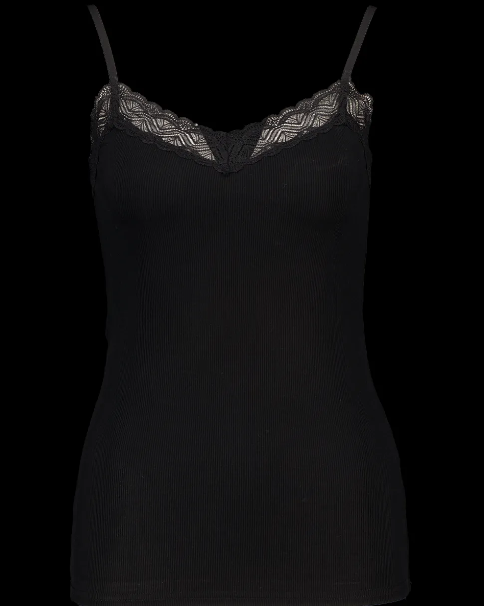 Deze zwarte singlet voor vrouwen is gemaakt van katoen met een klein deel elastaan. Het materiaal zorgt voor een comfortabele pasvorm door de licht rekbare eigenschap. Dit kledingstuk heeft smalle bandjes en een rand met kant voor een eenvoudig, netjes uiterlijk.