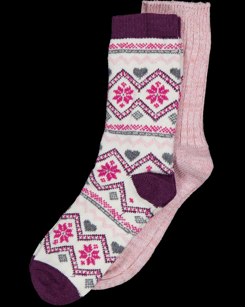 Deze paarse sokken voor vrouwen zijn gemaakt van een mix met wol, polyester en acryl. Eén paar heeft een dessin met verschillende patronen en het andere paar is effen van kleur. Ze bieden warmte en comfort door de combinatie van materialen.