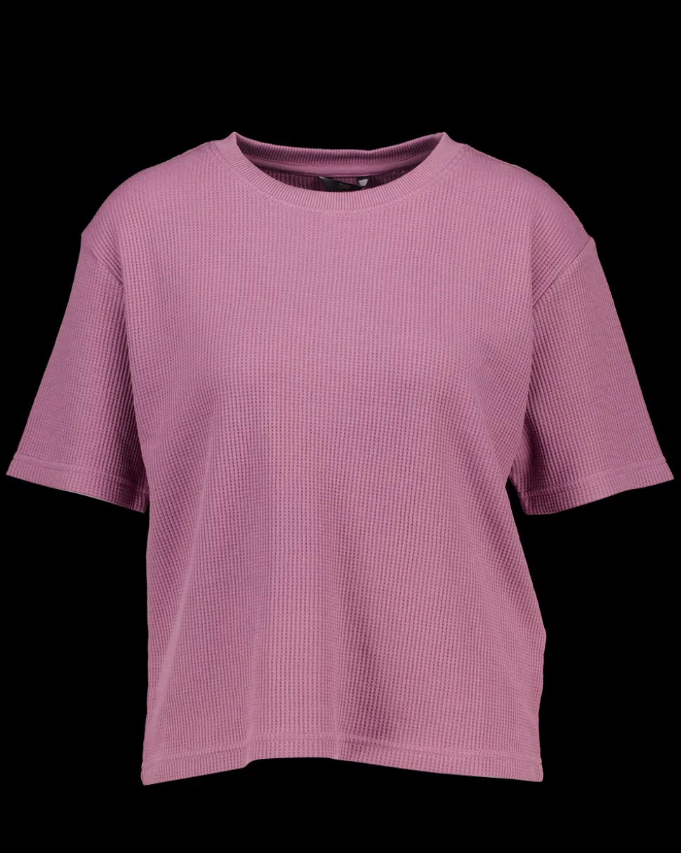 Dit basic T-shirt voor dames heeft korte mouwen en een ronde hals met een smalle zoom. De wafelstof is voor 50% gemaakt van katoen en voor 50% van polyester. Het polyester bestaat voor minstens 50% uit gerecycled materiaal. Dit wil zeggen dat voor minimaal de helft van de stof, restmateriaal uit eerdere productie opnieuw is gebruikt. Het restmateriaal wordt teruggebracht tot de vezel en tot een nieuw garen gesponnen. Zo zijn we zuiniger op materialen. Door de combinatie van katoen en polyester voelt de stof zacht aan, slijt het minder snel en is het minder kreukgevoelig.