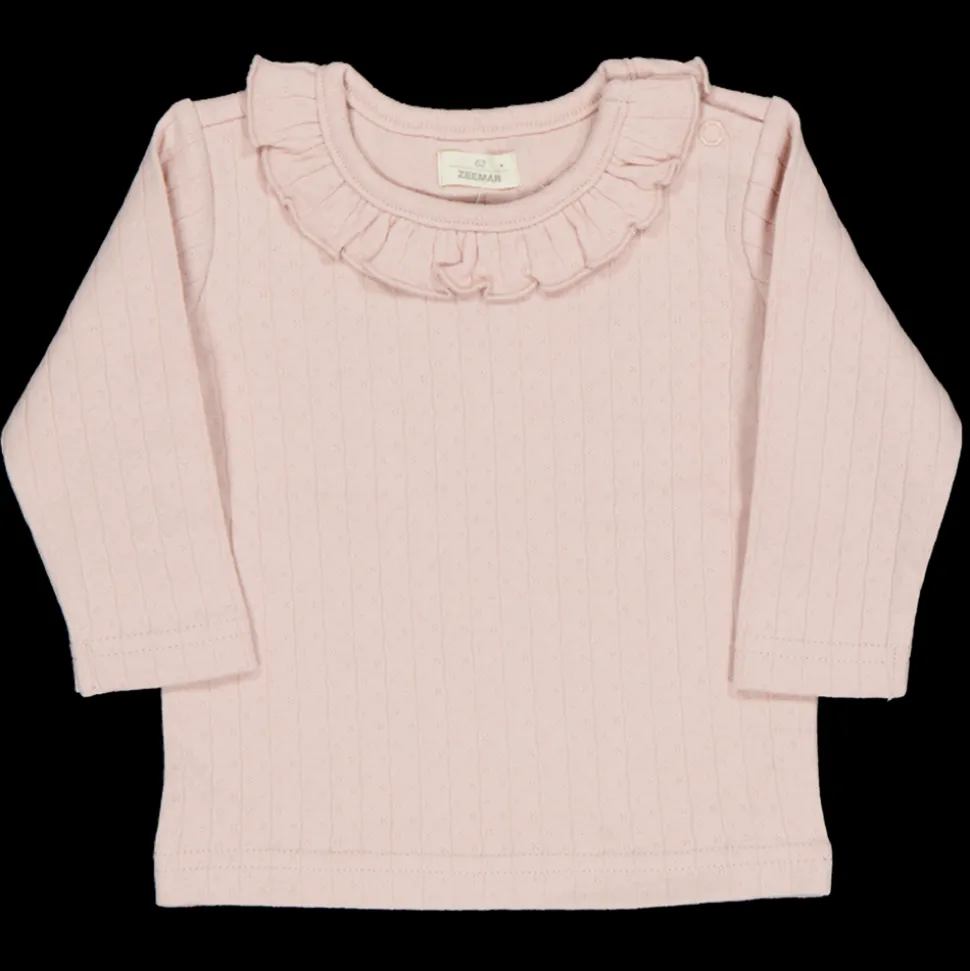 Dit T-shirt voor meisjes is gemaakt van 100% katoen, wat zorgt voor een zacht en ademend gevoel. De zachte roze kleur en de ruches bij de hals geven het een vrolijke uitstraling. Met lange mouwen is dit shirt een fijne keuze voor frisse dagen. Het is eenvoudig te combineren met andere kleding.