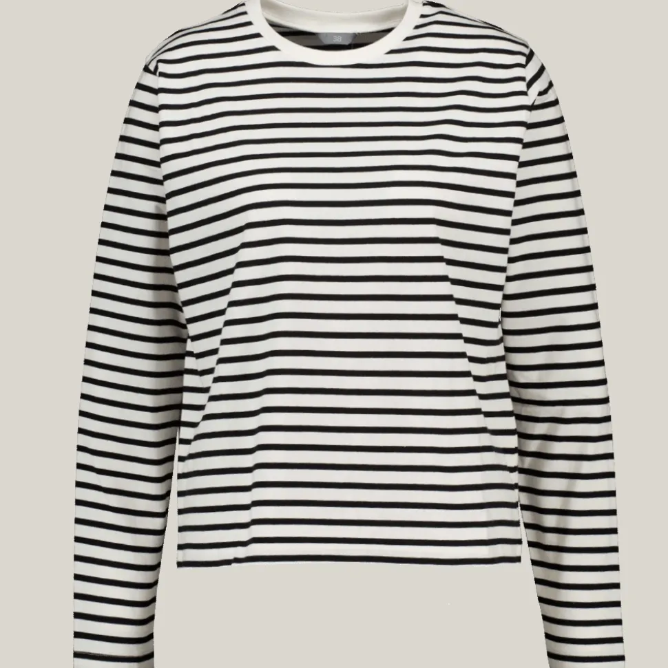 Dit T-shirt is gemaakt van 100% katoen, wat het zacht en comfortabel maakt. Het wit met zwarte strepen geeft een frisse uitstraling. Met lange mouwen en een ronde hals is het ideaal voor verschillende combinaties. Dit shirt is een praktische keuze voor in je garderobe.