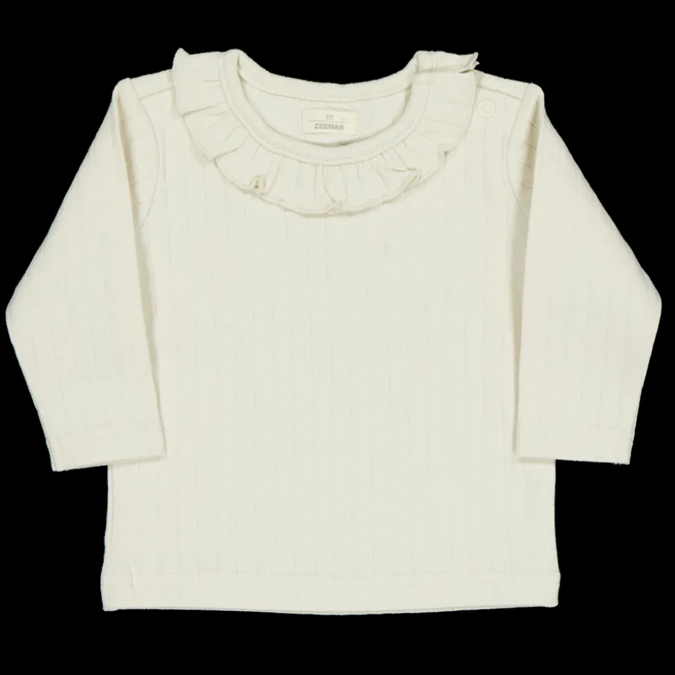 Dit T-shirt voor meisjes is gemaakt van 100% katoen, waardoor het zacht aanvoelt op de huid. De uitstraling is eenvoudig en tijdloos, met een speelse ruches rond de hals. Dit T-shirt is gemakkelijk te combineren en biedt comfort tijdens het spelen en ontdekken. Geschikt voor de allerkleinsten.