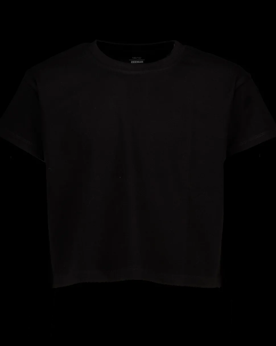 Dit zwarte T-shirt voor meisjes heeft korte mouwen en is gemaakt van 100% katoen. Het materiaal voelt prettig aan op de huid en is geschikt voor de zomer. Het eenvoudig ontwerp maakt het T-shirt gemakkelijk te dragen bij verschillende outfits.