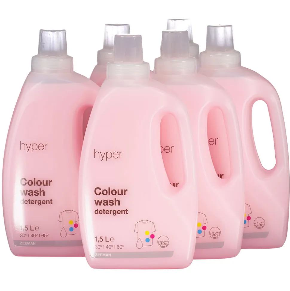 Ons Hyper Wasmiddel kleur is geschikt voor jouw kleurwas en is extra goedkoop doordat we grote hoeveelheden laten maken. Het wast goed en heeft een frisse, neutrale geur. Eén fles is goed voor ongeveer 20 wasbeurten gaat dus lang mee. Verkrijgbaar per 6 stuks van 1,5 L. De getoonde prijs is per stuk.