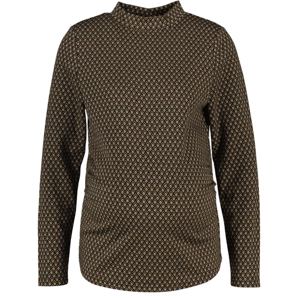 Op zoek naar een fijne zwangerschapstop van goede kwaliteit? Deze bruine top met lange mouwen is ruimer gemaakt rondom de buik met extra stof en plooien. Hierdoor knelt het shirt niet wanneer de baby groeit en de buik groter wordt. De ingeweven print zorg voor een unieke uitstraling. Onze zwangerschapskleding groeit met je buik mee. Je kunt daarom gewoon je normale maat kiezen, zonder te letten op je taille.